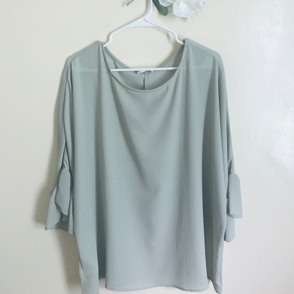 Scoop neck ruffled blouse in a very light, sage green color. Plus sizes.
