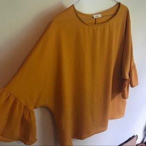 Scoop neck ruffled blouse in mustard. Beautiful in person. Plus sizes.