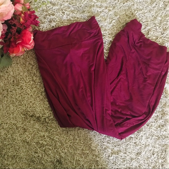 Stretchy material, simple burgundy maxi skirt. Will need a slip underneath as it is semi- sheer.