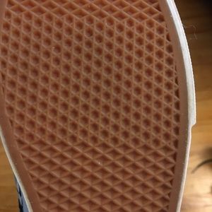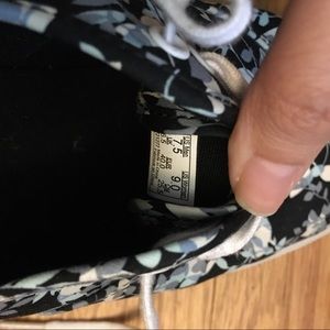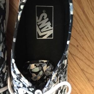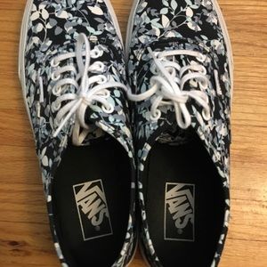 The vans have only been worn a few times and still look brand new. The colors of the pastel blues and white leaves pattern compliments the overall black background of the shoe:)