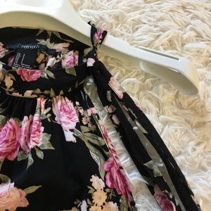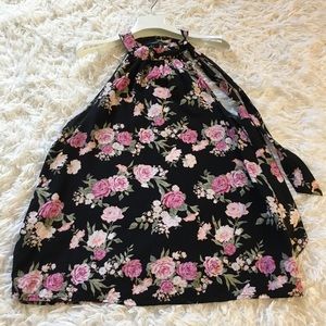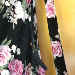 This cute tank top has a unique neck line that is tied around and can be worn as a bow on the side or streaming down. The different shades of pink roses complement the black background beautifully. Very minor white marks in one sleeve area.