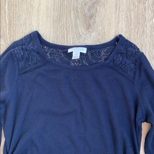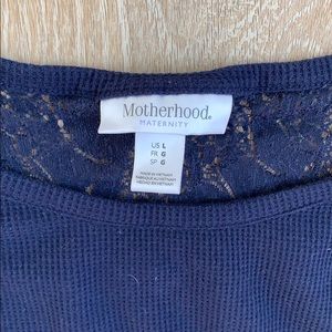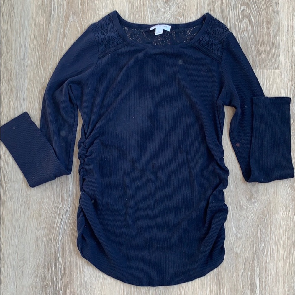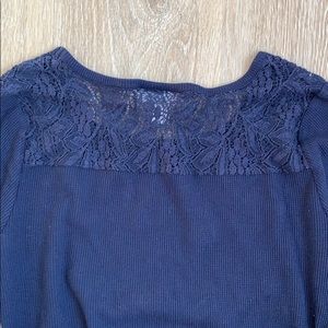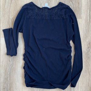 Beautiful dark blue lightweight maternity sweater with lace detailing at the shoulders and on the back.