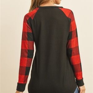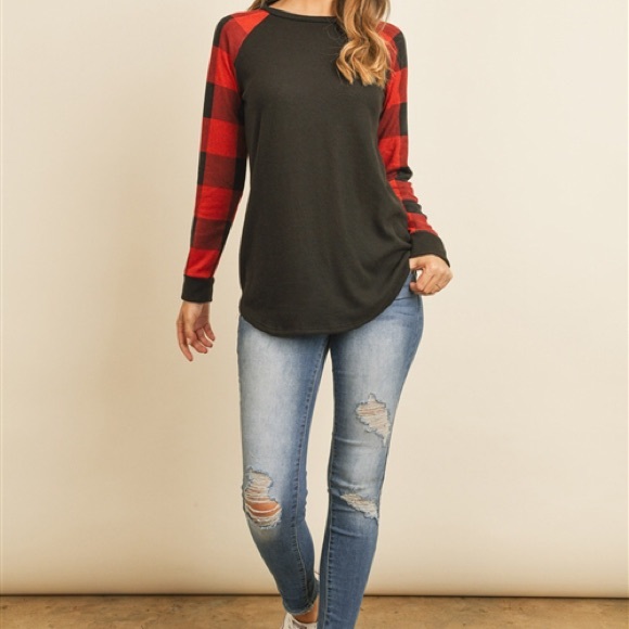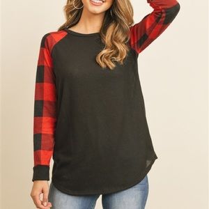 Long sleeve Buffalo plaid tee, black with red and black sleeves.