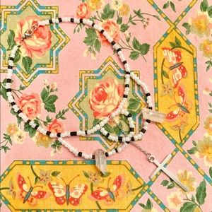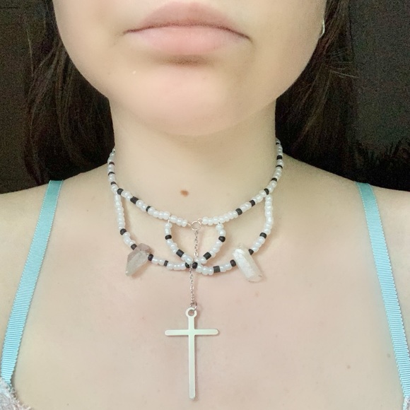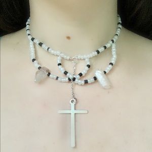 black and white beaded wire with quartz accents and silver cross. beads are glass/lava rock and pendant is a zinc alloy. stainless lobster clasp. 100% lead and nickel free