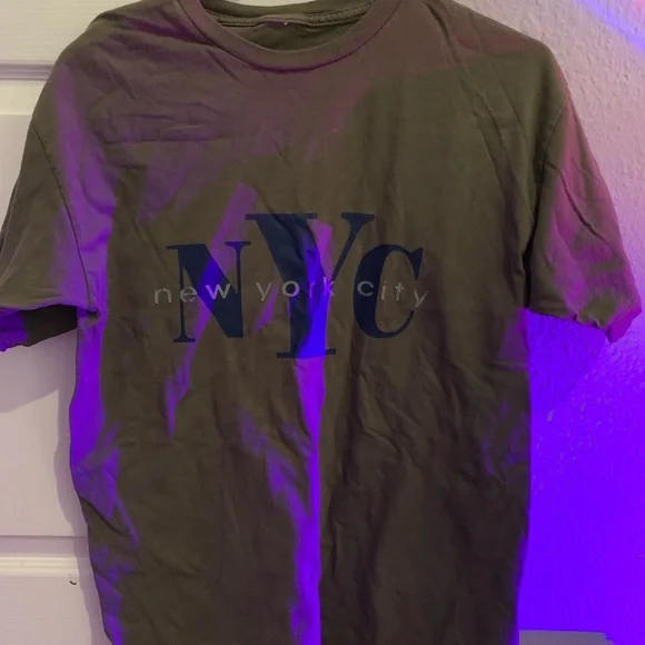 super cute army green shirt with navy blue nyc graphic, never worn, in great condition!