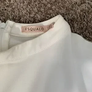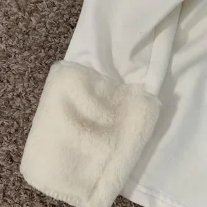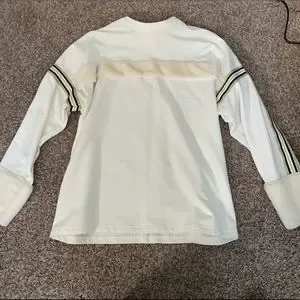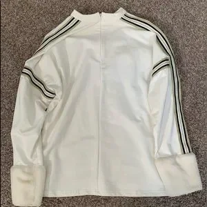 super cute white sweater with puffy soft sleeves. there are also gold and black stripes along the sleeve. never been worn in great condition!