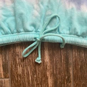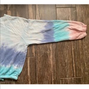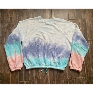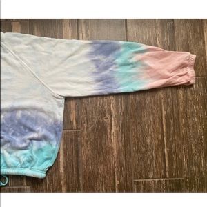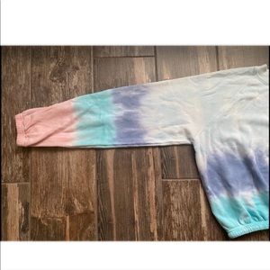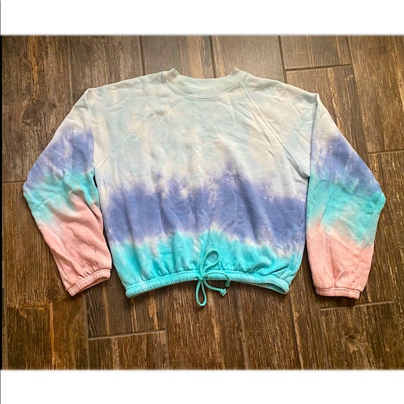 This tie dye sweatshirt is super cute and fluffy! It is brand new but unfortunately doesnβt still have tags! It has a tie around the whist that is adjustable! It has nothing wrong with it! I unfortunately donβt know the brand but it is great quality!