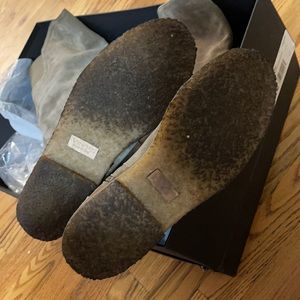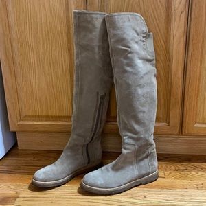 Vince above the knee suede boots. Worn 2x. Bottom is dirty, but that material gets dirty very easily even when worn twice. Upper suede in perfect condition. Taupe color.