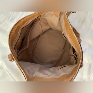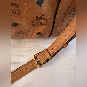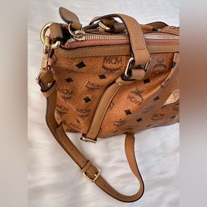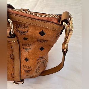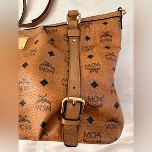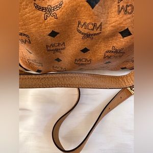 Pre-loved but in good condition. This bag is crafted of coated canvas in cognac with the classic black MCM monogram print and gold tone hardware. The shoulder bag has a leather strap handle and comes with an optional shoulder strap. The top opens to a beige fabric interior with zipper and patch pockets. Interior is clean. Exterior shows signs of use like creases and scuffs.
