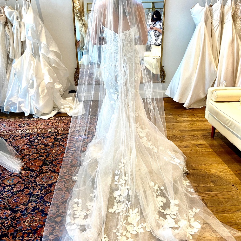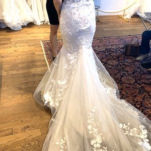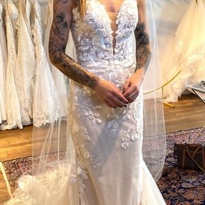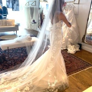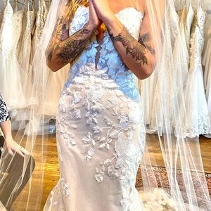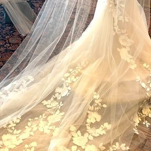 Never before worn or taken out of garment bag, this gown is a champagne wedding dress with ivory and nude accents.