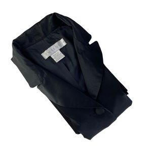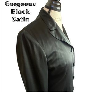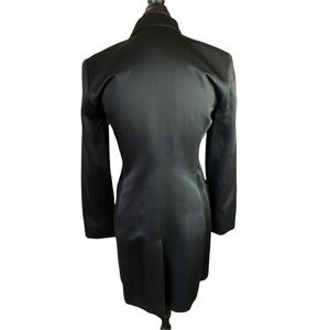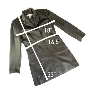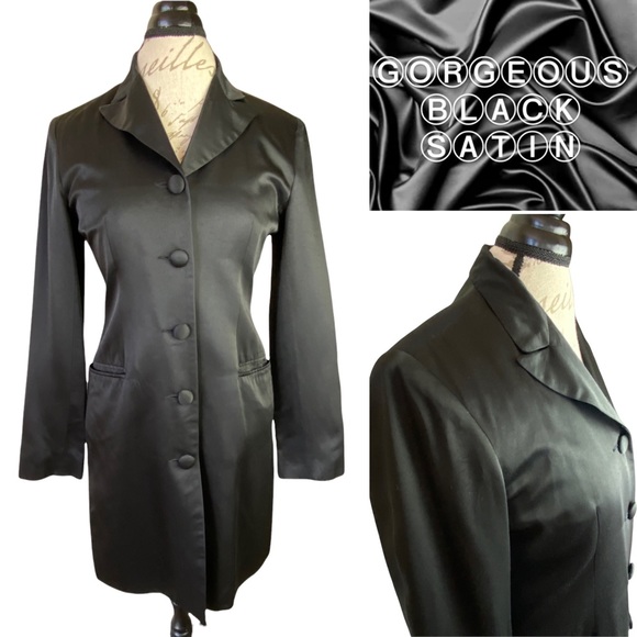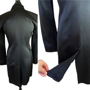 FEATURE(s): long sleeve, long jacket, spread collar, sexy comfy slit at the back, single breasted, 5 fabric covered buttons, 2 side pockets