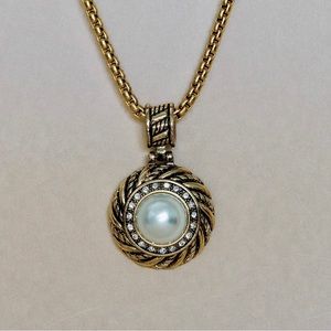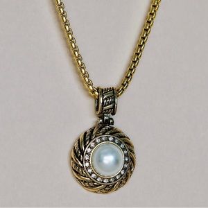 The JACINTA Necklace has a vintage feel thanks to its statement pearl centre that sits strikingly in a twisted, circular frame thatβs surrounded by clear gems. The pendant is supported by a box chain.