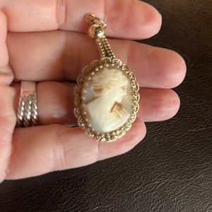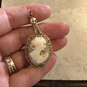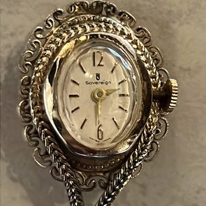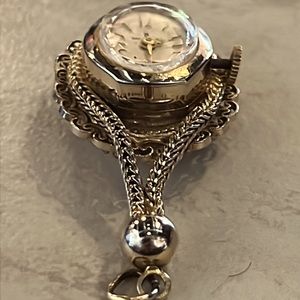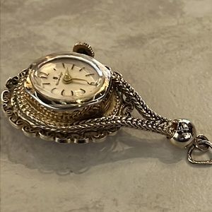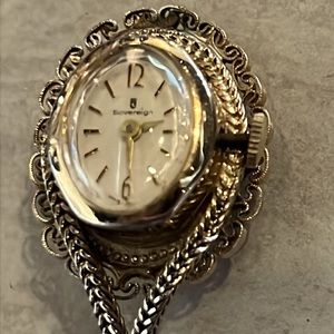 This is an exquisite two sided pendant with a gorgeous carved cameo on one side and a working watch face on the other. In pristine condition and still works! Keeps time perfectly! Wind dial. Filigree gold tone border with a fancy wheat chain bordering the timepiece. Has a nice size soldered O ring to put on a chain to wear as a multipurpose pendant! This piece is SWISS MADE, SOVEREIGN is clearly seen of the timepiece face. Only one that I've seen like this- SWISS MADE. Perfect for any occasion, especially for those who delight in rare & unique pieces!