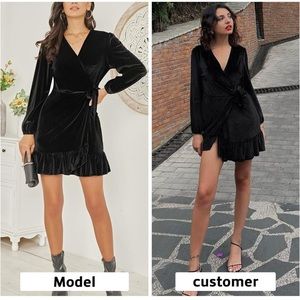 Feature:Velvet makes the dress a quintessential item in cool weather.The plunging v neck showcases your collarbones and cleavage,giving you an effortlessly sexy look,while the ruffle hem lends a touch of romance to the dress.Plus, waist tie can be adjusted according to different shape.