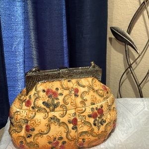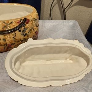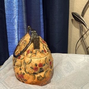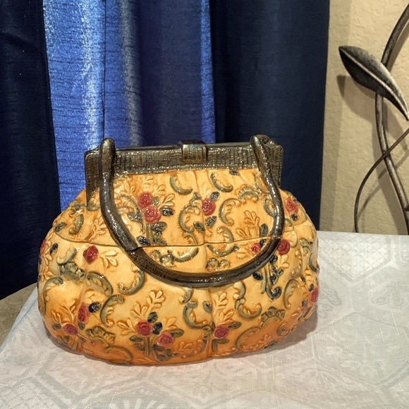 VINTAGE WCL ROSE COVERED YELLOW CLUTCH PURSE CERAMIC COOKIE JAR 10” W x 6.5” D x 6. 5” H..still in very good condition.. no chips no cracks..great for goodies, or display in your bathroom for some accessories.. get creative.. please see all pictures….(48)