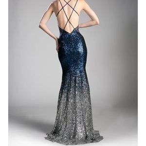 Sequined dress fit-n-flare, v-neck with illusion mesh on he sides stones on mesh panel. Strappy criss-cross back. Black or navy sequins fade into silver sequins on the bottom half of the dress.