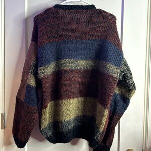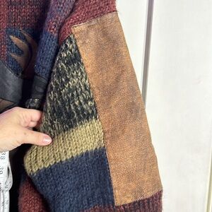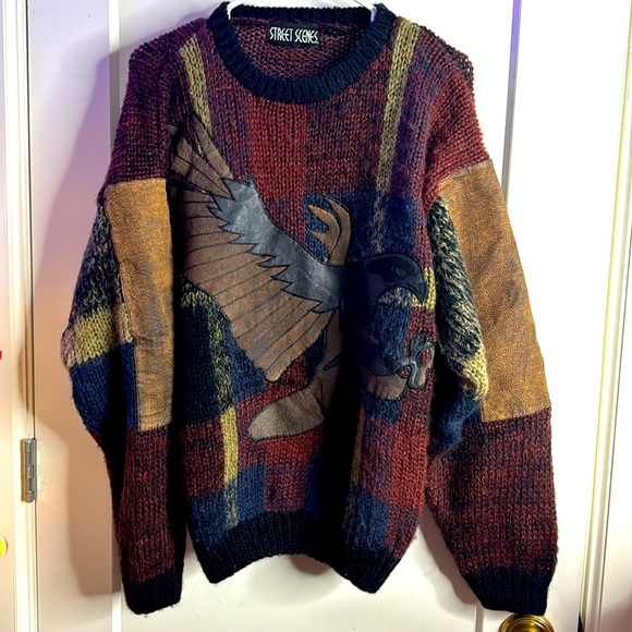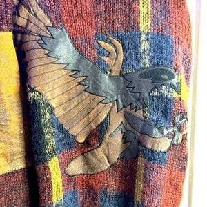 circa 1990s this sweater is amazing. Complete with weather patches on the sleeves and the eagle made out of leather. Acrylic/Leather. Minor wear. Pointed out.