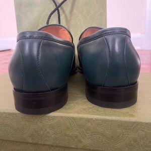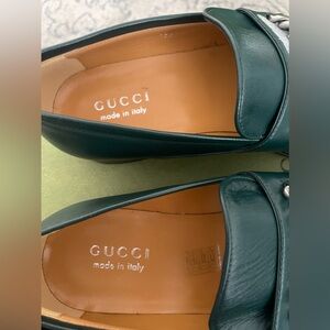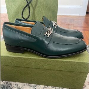 Brand new never worn AUTHENTIC menโs Gucci loafers.green leather with silver metal chain detail, beautiful shoe. MENS UK 9 EQUIVALENT to US 9.5