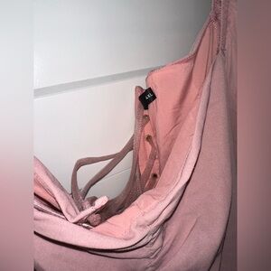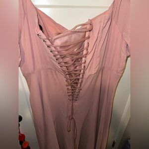 Blush pink long formal dress with corset back & off the shoulders sleeves.