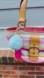 Chic Coach shoulder bag with pink and tan stripes. Features playful accents and a stylish design.