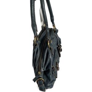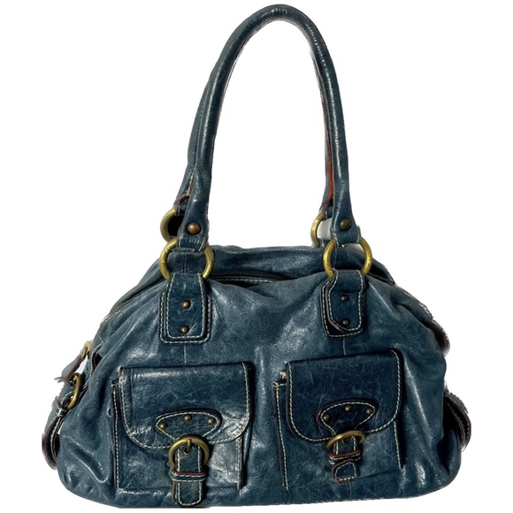 Dark Turquoise leather bag with rusty gold embellishments. Bag was cleaned with: