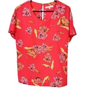 Chic red blouse with floral design. Short sleeves and relaxed fit. Ideal for casual outings.