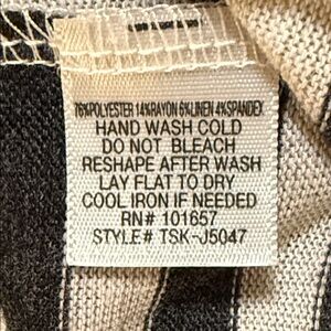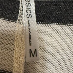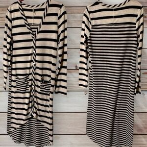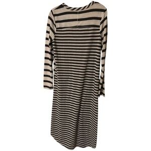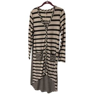 Stylish black and cream striped dress with long sleeves and pockets. Perfect for casual outings.