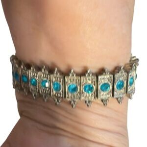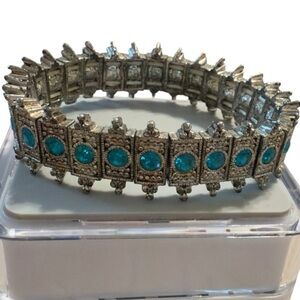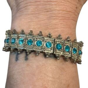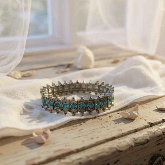 Elegant silver bracelet featuring vibrant turquoise stones. Perfect for adding a touch of color to any outfit.