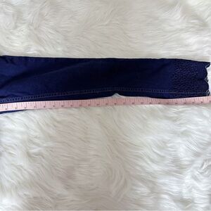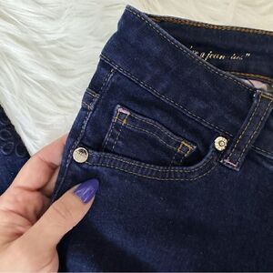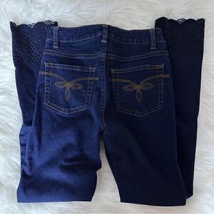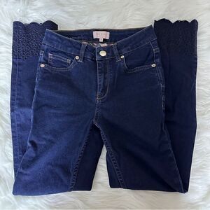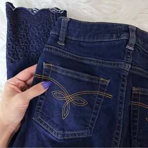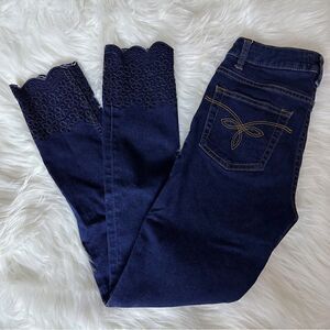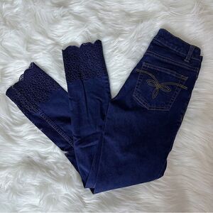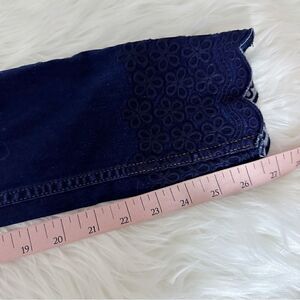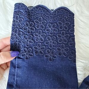 -Embroidered eyelet hem detailing with matching threading and denim wash