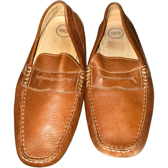 Classic tan leather loafers by 1901. Sleek slip-on design. Ideal for versatile wear. ๐๐๐ฌ ๐ฌ๐จ๐ฆ๐ ๐ฐ๐๐๐ซ ๐๐ซ๐จ๐ฎ๐ง๐ ๐๐จ๐ญ๐ญ๐จ๐ฆ ๐๐๐ ๐๐ฌ ๐จ๐ ๐ฅ๐๐๐ญ๐ก๐๐ซ-๐ง๐๐๐๐ฌ ๐ฉ๐จ๐ฅ๐ข๐ฌ๐ก๐๐. ๐๐ก๐ ๐ญ๐จ๐ฉ ๐๐ง๐ ๐๐จ๐ญ๐ญ๐จ๐ฆ ๐ข๐ง ๐ ๐ซ๐๐๐ญ ๐๐จ๐ง๐๐ข๐ญ๐ข๐จ๐ง