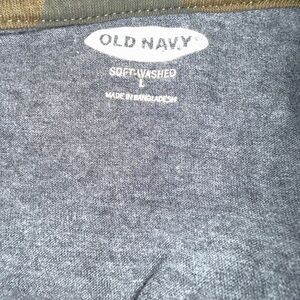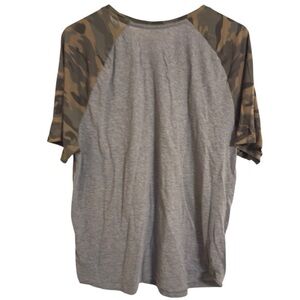 Stylish gray top with unique camouflage raglan sleeves. Perfect for a casual day out.