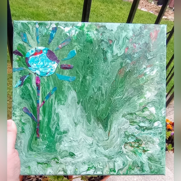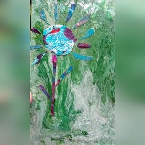 To create it I used my "paint skins" for the flower. Those are the drippings from my paint pour artwork which I let dry then use them to create jewelry or paintings like this. The background is just paint poured.