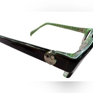 • Features: These frames often feature a striped brown or Havana exterior with contrasting green patterned inner temples. They include the signature Kate Spade logo on the temple arms.