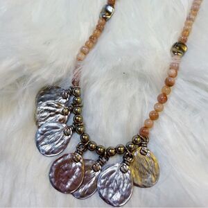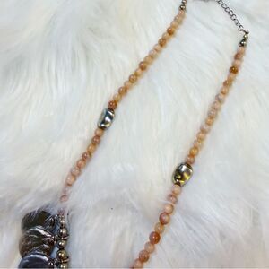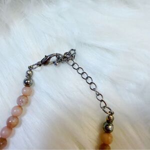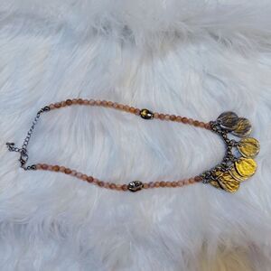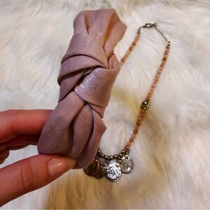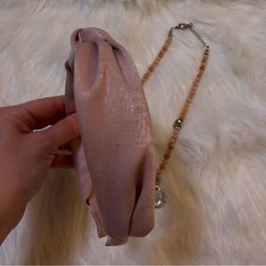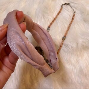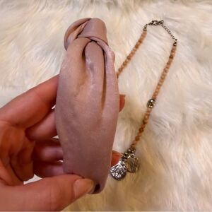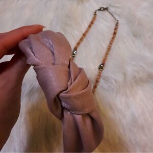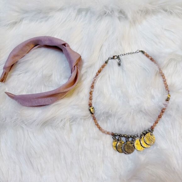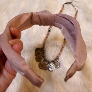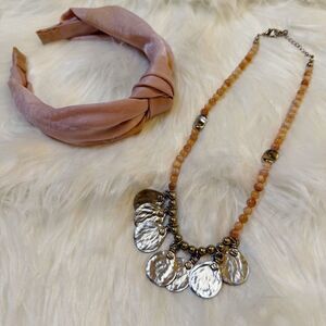 Light rose pink bead necklace featuring silver coin charms paired with a stylish matching hue pink headband. Perfect for adding a touch of sophistication and accent detailing