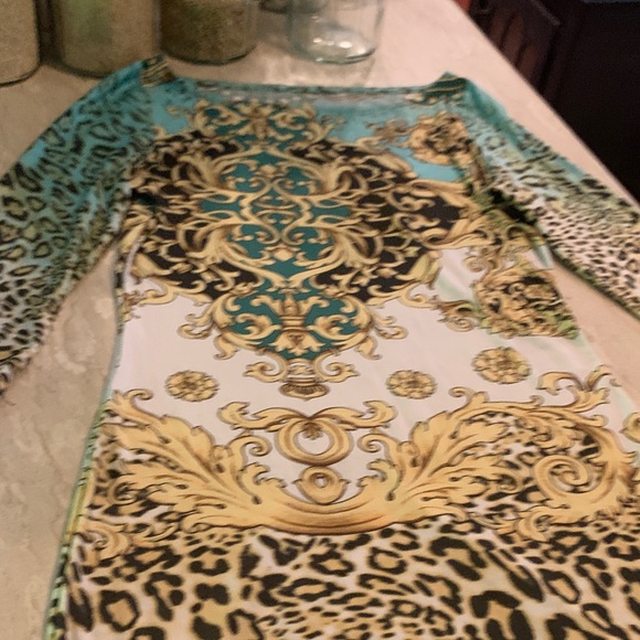Stand out with this adjustable animal print dress featuring vibrant colors like turquoise and yellow, reminiscent of Versace-inspired prints.