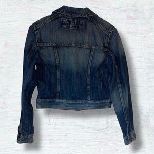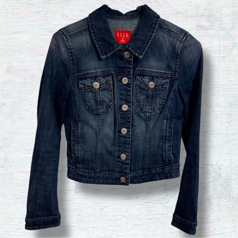 Chic charcoal denim jacket. Features button closure and front pockets. Classic collar design.