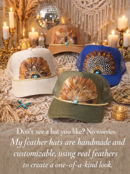 Donβt see a hat you like? No worries. My feather hats are handmade and customizable, using real feathers to create a one-of-a-kind look. Just message me the style youβd like and Iβll make it for you!