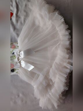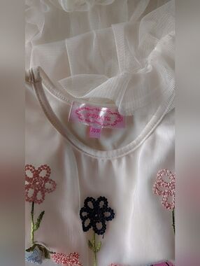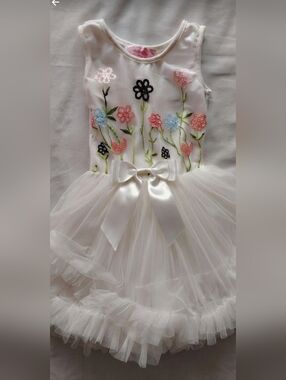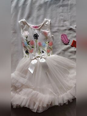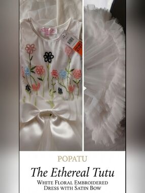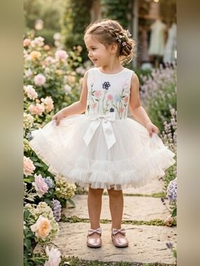 This breathtaking boutique tutu dress by Popatu features a sleeveless white bodice adorned with intricate, multi-colored floral embroidery and a stunning satin bow at the waist. The full, tiered tulle skirt adds the perfect amount of volume for twirling and play. Whether it's a birthday, a wedding, or a spring photoshoot, this dress is pure magic.