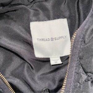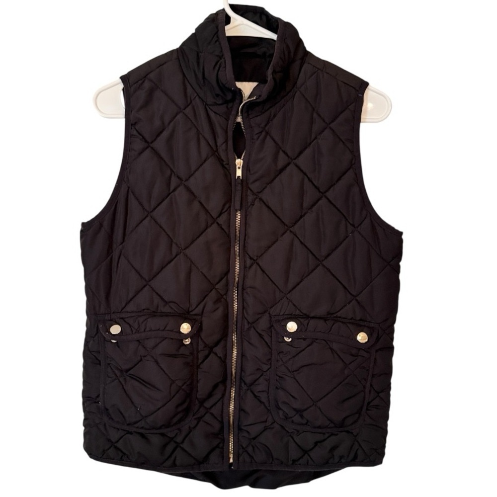 Elegant charcoal quilted jacket. Features a sleek zipper and cozy design.