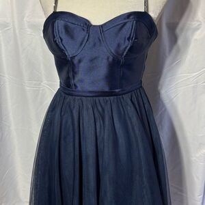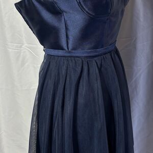 Stunning navy blue satin dress. Features sparkling rhinestone straps. Perfect for special occasions.