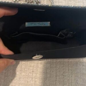 Sparkling Kate Landry evening clutch featuring rhinestone accents and a silver chain. The nameplate still has its protective plastic. Gently used once for an Andrea Bocelli concert (less than three hours).