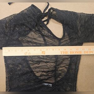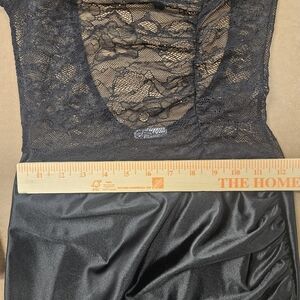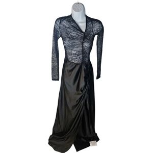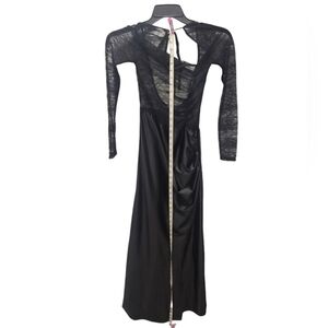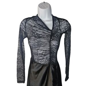 The dress features a beautiful lace pattern and mesh accents, making it a unique and stylish choice for any wardrobe. It comes in a black color and is available in size 4-6.
