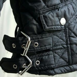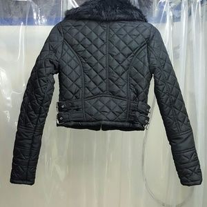 Cropped Motorcycle Jacket, has double waist buckle. Diamond elegant quilt.