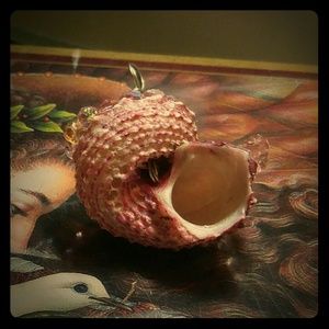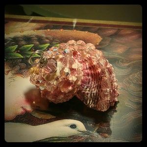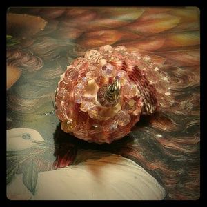 Natural Pink Lighting Whelk Seashell Pendant, Jeweled with Pink Swarovski Crystals, Along the Swirling Outer Edges Upward to Its Peak, Glistening in the Sunshine, Capturing a Memory of a Perfect Summer Day at the Ocean Seashore.