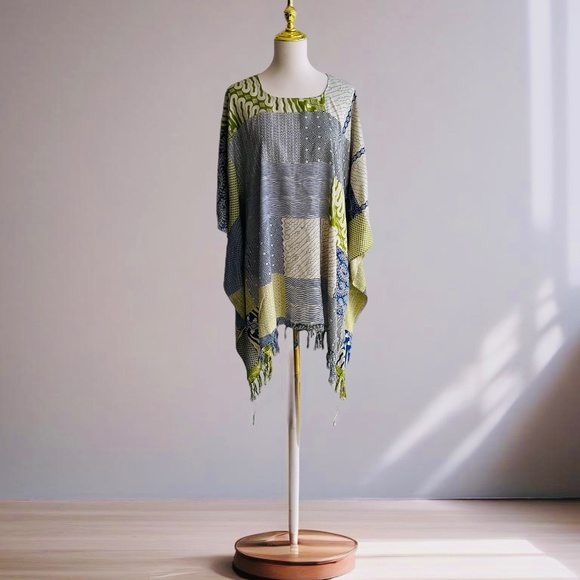 0025/ Green Blue Color Poncho with fringed, Batik Poncho