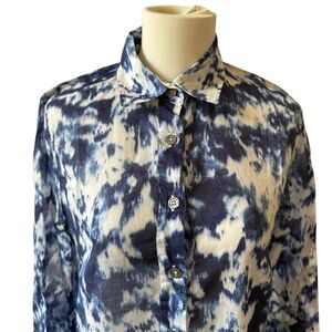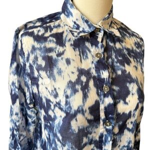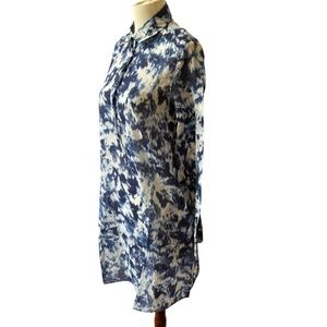 Size XS, 100% breathable cotton, lightweight, shirt dress, side pockets, long sleeves, knee length, tie dye print.