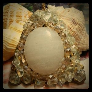 Artisan Handcrafted Pendant Featuring a Large Natural Blush Rose Quartz Gemstone, Encircled by Blush Swarovski Crystals and White Natural Topaz Gemstone Nuggets.