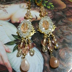 Handcrafted Artisan Gemstone Peach Swarovski Crystal and Peach Moonstone Chandelier Earrings.