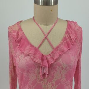 Elegant pink mesh dress with ruffle details. Features a stylish criss-cross neckline.
