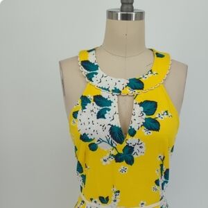 Bright yellow halter dress with a vibrant floral pattern. Features white and green flowers for a fresh look.